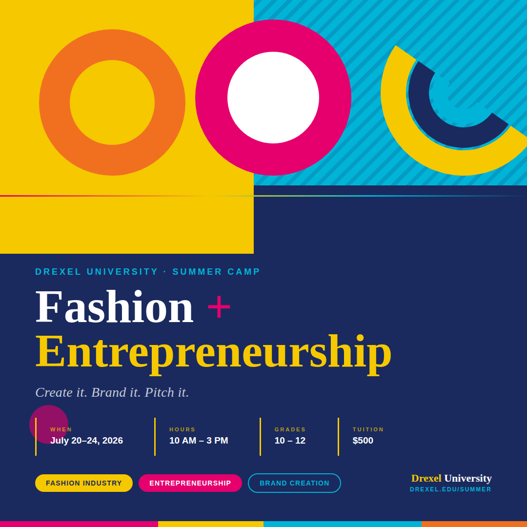 Love fashion? Curious how brands actually get built? At Drexel’s Fashion + Entrepreneurship Camp, you’ll learn how to turn creative ideas into real business concepts. Work with students like you to explore trends, create a fashion concept, build your brand story and discover how successful companies market and sell their products.